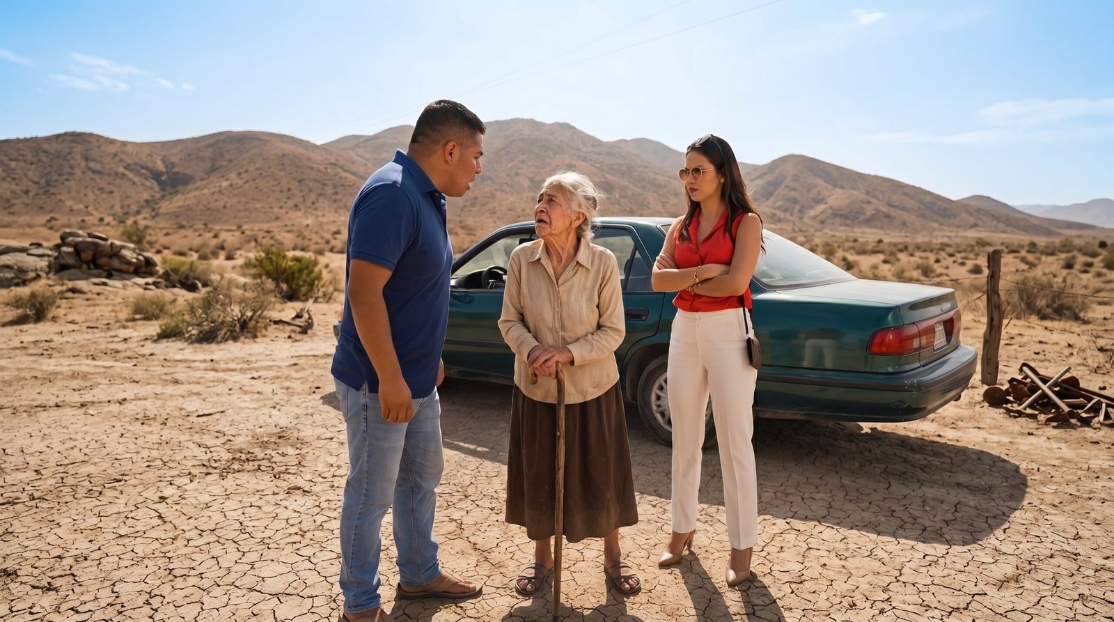 Patricia, sentada en el asiento del copiloto, tampoco usaba gafas. Su mirada descubierta reflejaba una maldad pura mientras sostenía la vieja libreta de su madre. Afuera, la temperatura superaba los 45 grados. Habían dejado a Doña Carmen tirada en la arena hirviendo, condenándola a una muerte agónica por deshidratación, todo para evitar pagar sus cuidados médicos y adueñarse de la fortuna familiar esa misma tarde.