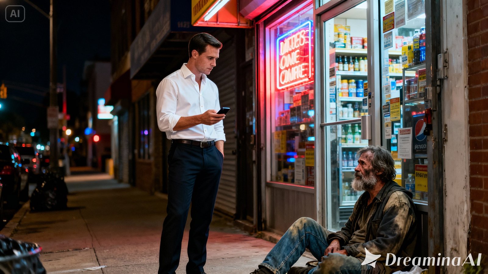 Nadie sabía su nombre real. Algunos lo llamaban “El Flaco”, otros simplemente “el loco de la esquina”. Dormía frente a la tienda, barría la acera al amanecer y, sin que nadie se lo pidiera, vigilaba el lugar como si fuera suyo. La gente del barrio lo sabía: mientras ese hombre estuviera ahí, nadie se atrevía a tocar el negocio.
