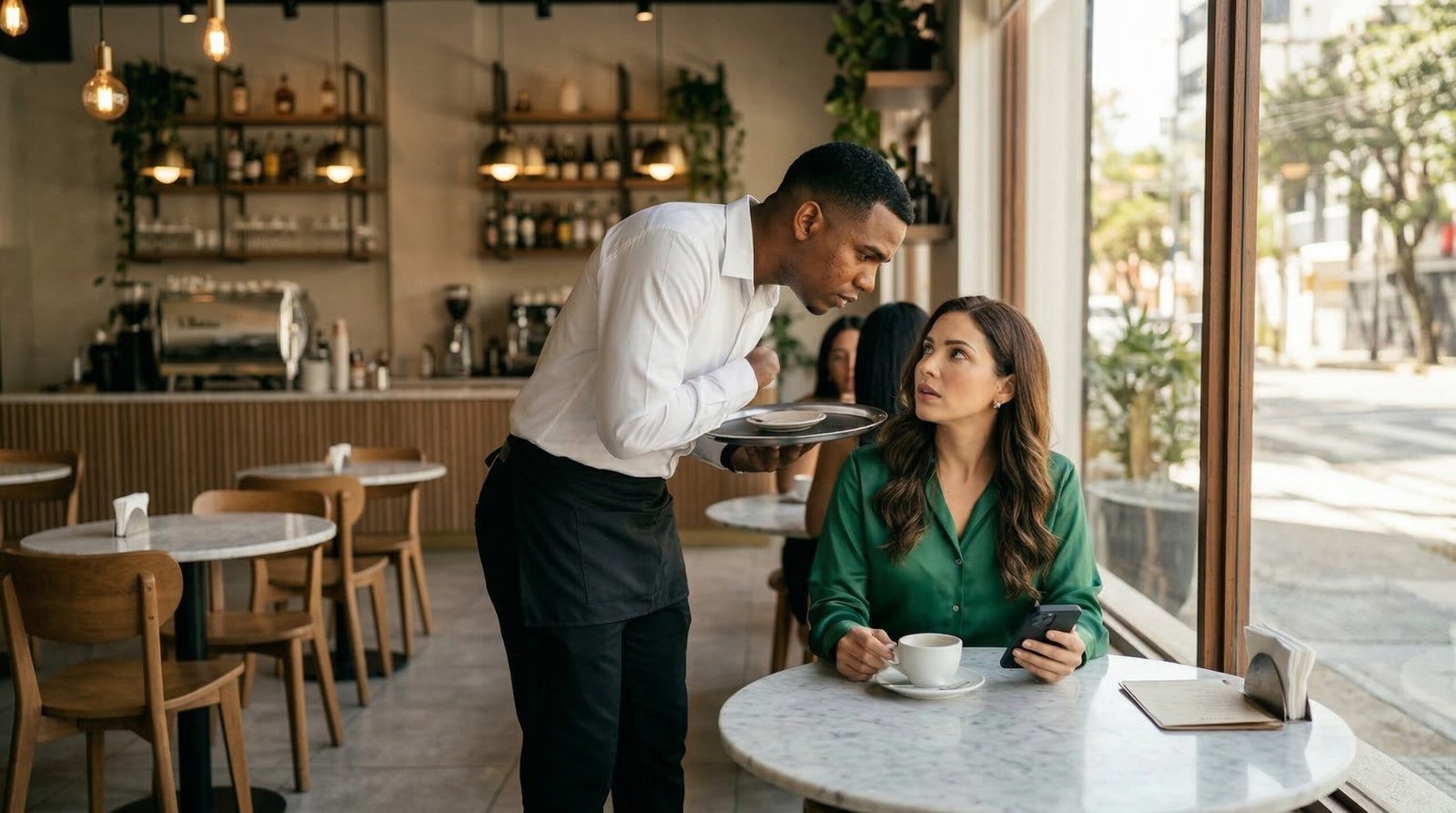 Fue entonces cuando el mesero, el joven de mirada seria y postura firme, rompió el tenso silencio.