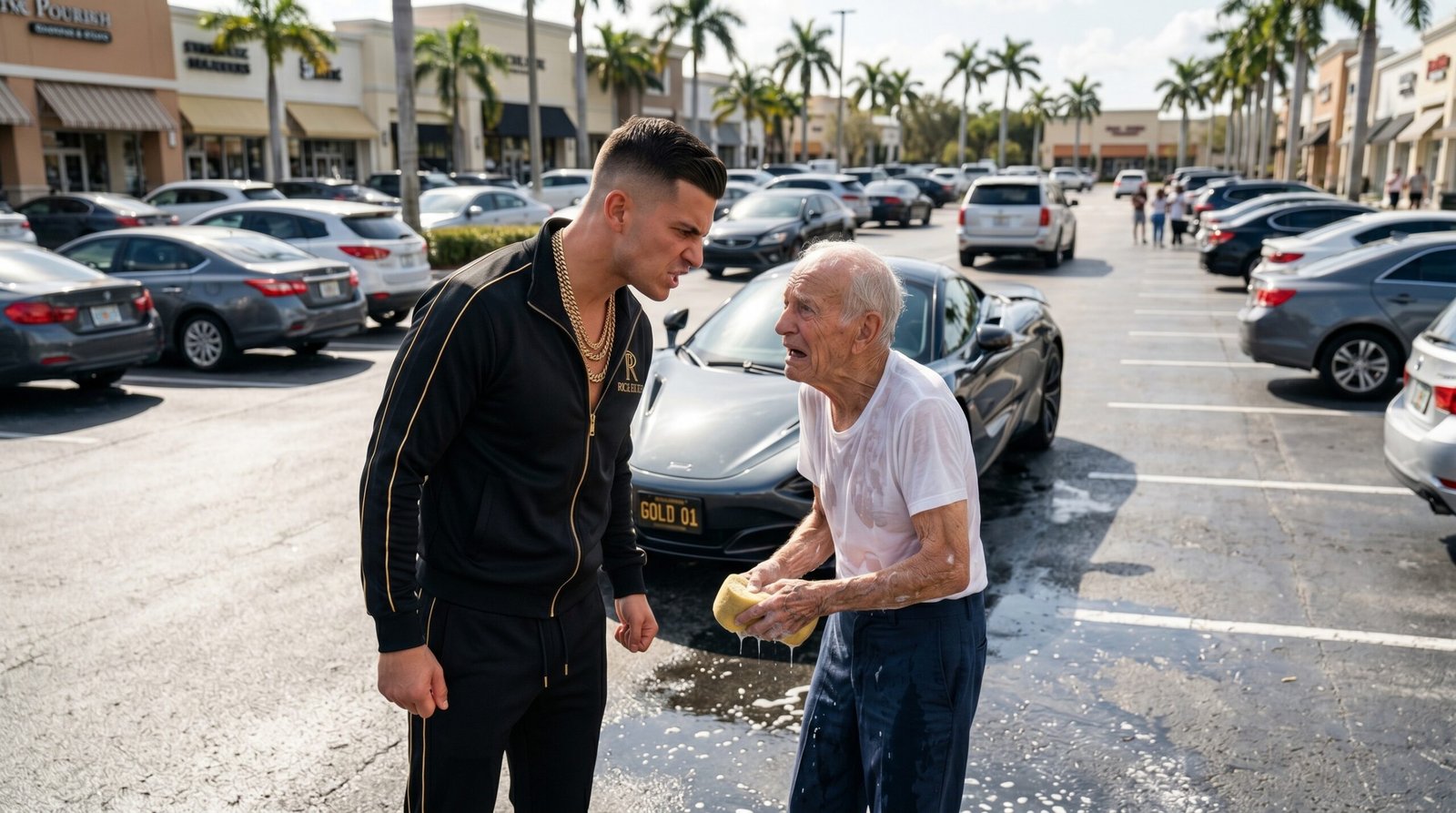 El muchacho vestía ropa deportiva que costaba más de lo que muchos ganan en un año. Sus cadenas de oro tintineaban con cada movimiento cargado de agresividad. Don Arturo, con las manos temblando por la edad y el esfuerzo, solo intentaba limpiar el vehículo para asegurar su comida del día. La esponja húmeda rozó el capó y dejó una simple marca de agua. Eso fue suficiente para desatar el monstruo interior del joven.