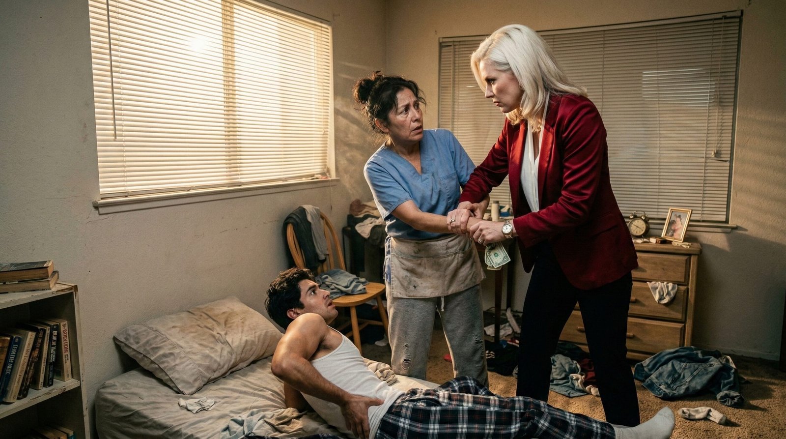 Cuando entré nuevamente al cuarto, el ambiente había cambiado. La muchacha que estaba con él se estaba subiendo los pantalones a trompicones, pálida y sin atreverse a mirarme a los ojos. Luis estaba sentado al borde de mi cama, con los pantalones a medio abrochar y la camisa desabotonada. El color no le había regresado a la cara. Seguía mudo, con la boca entreabierta, intentando procesar que su cajero automático personal, su madre, estaba parada frente a él.