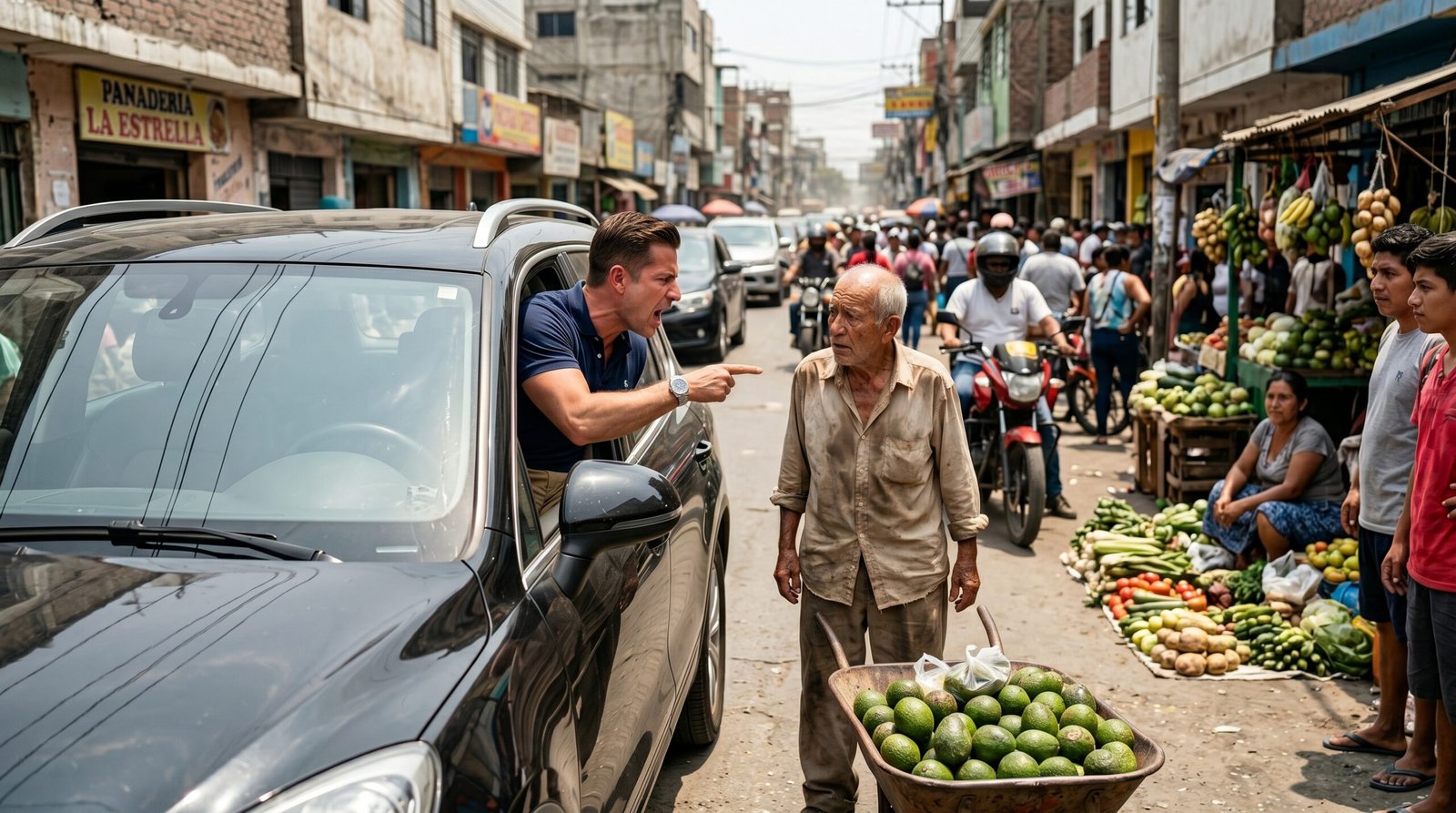 Don Ramón suplicó paciencia. Mostró su dolor físico, esperando que el conductor entendiera que no era terquedad, sino incapacidad. Pero para el hombre de la camisa cara, un vendedor callejero no merecía ni un segundo de su valioso tiempo. La patada que le dio a la carretilla fue un acto de pura maldad. Ver los aguacates reventarse contra el pavimento sucio fue ver el esfuerzo de un hombre mayor tirado a la basura por puro capricho. El conductor se largó, convencido de que su dinero le daba derecho a pisotear a cualquiera.
