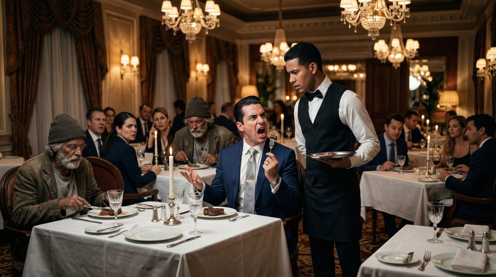 Julián necesitaba aparentar poder. Necesitaba que el entorno fuera perfecto. Por eso, cuando vio a un hombre vestido con ropa sucia sentarse en la mesa contigua, su estrés estalló. Creyó que ese «vagabundo» arruinaría la imagen perfecta que necesitaba proyectar para cerrar el trato de su vida.