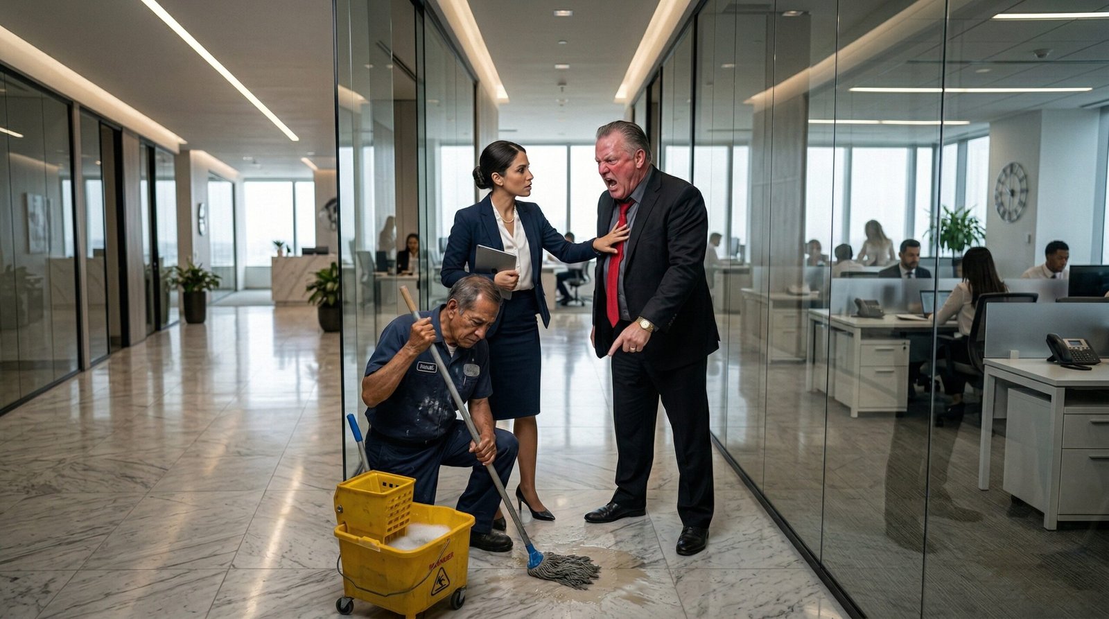 Manuel, el conserje de sesenta y cinco años, se quedó paralizado. Sus manos curtidas por décadas de trabajo pesado, manchadas por los químicos de limpieza, apretaron el mango de madera. Él había pasado los últimos tres años agachando la cabeza, soportando insultos, limpiando los zapatos de ejecutivos que lo miraban como si fuera invisible.