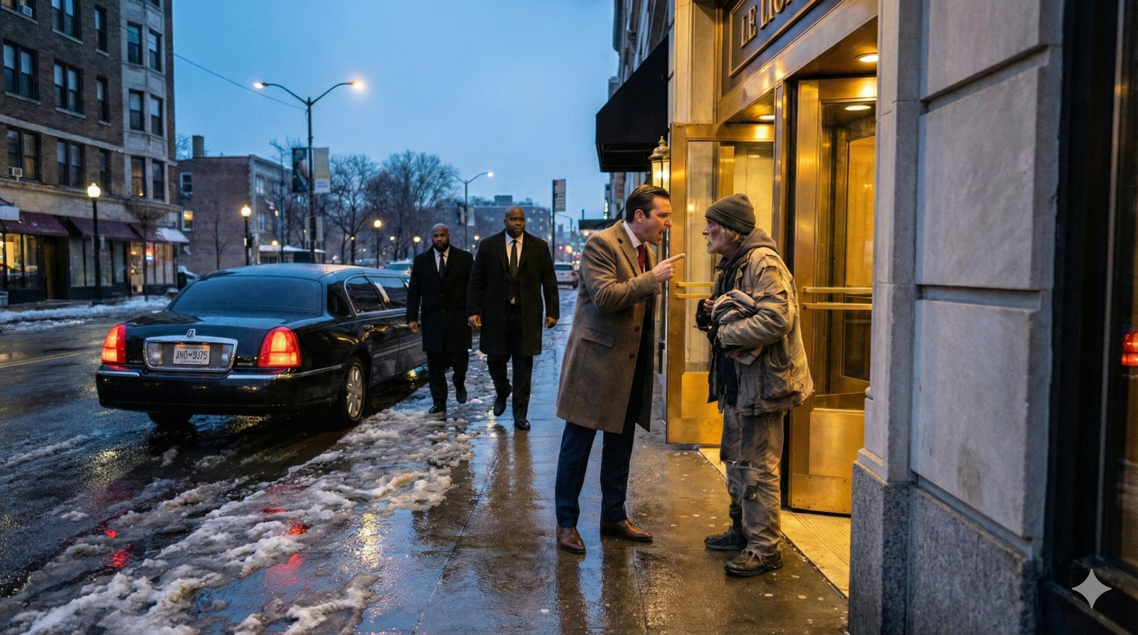 El «vagabundo», Don Roberto, no cambió su postura. Seguía emanando esa calma inquietante de quien no tiene nada que demostrar. No había rabia en sus ojos, solo una profunda decepción. Se limpió una mancha de pintura blanca que tenía en la solapa de su chaqueta vieja con una dignidad que contrastaba violentamente con la actitud barata y prepotente del hombre que intentaba echarlo.