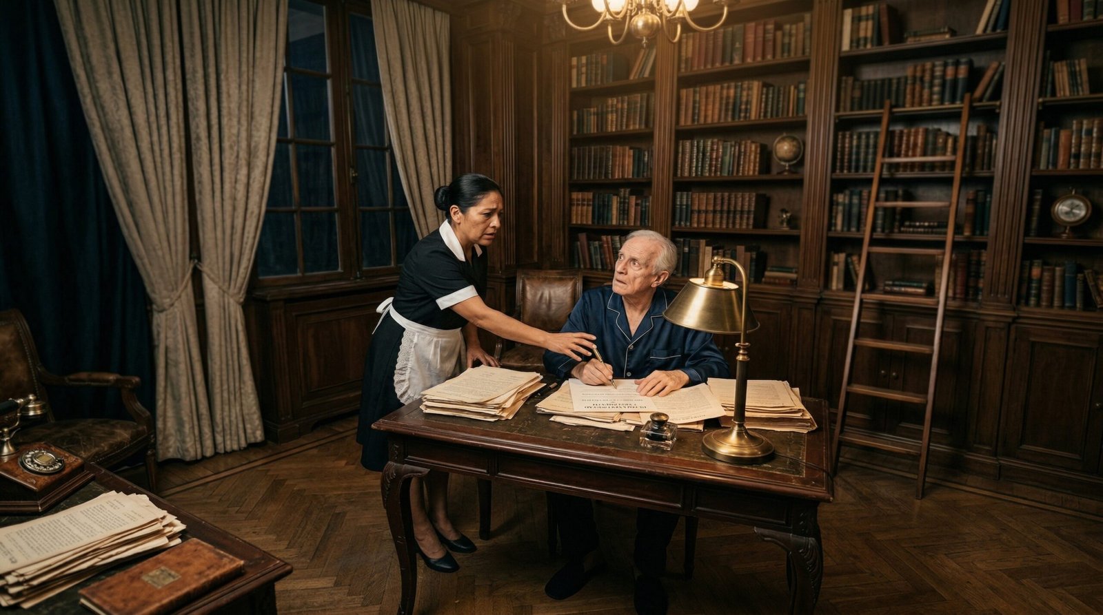 El tiempo pareció detenerse en la majestuosa biblioteca de la mansión. La pesada pluma de oro, esa que estaba a un milímetro de transferir un imperio empresarial y cuentas bancarias incalculables, resbaló de los dedos temblorosos de Don Ernesto.