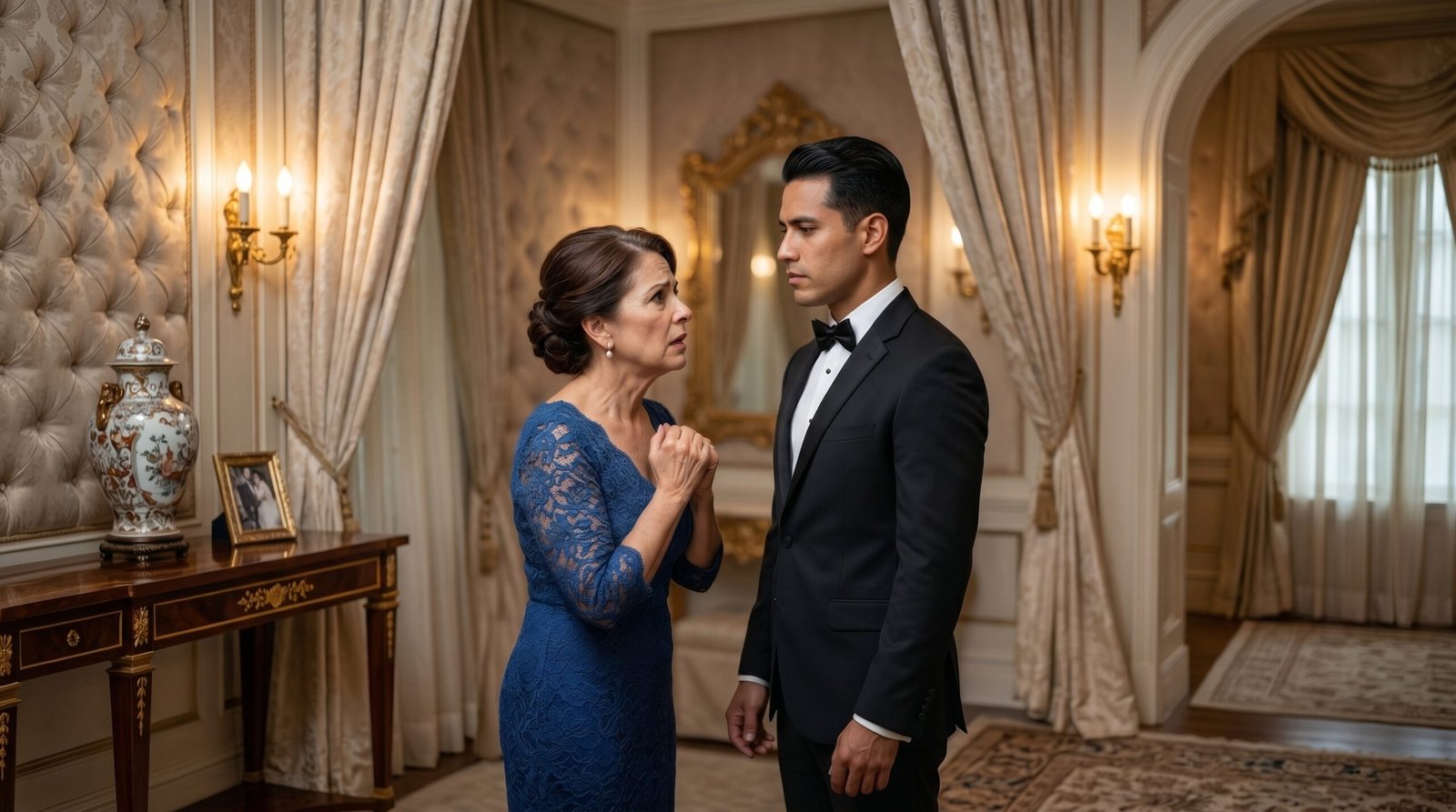 El silencio en la habitación privada de la iglesia era asfixiante. Mi madre, con su elegante vestido azul zafiro, todavía me sostenía del brazo. Sus manos temblaban, pero yo me mantenía firme como una estatua de mármol.