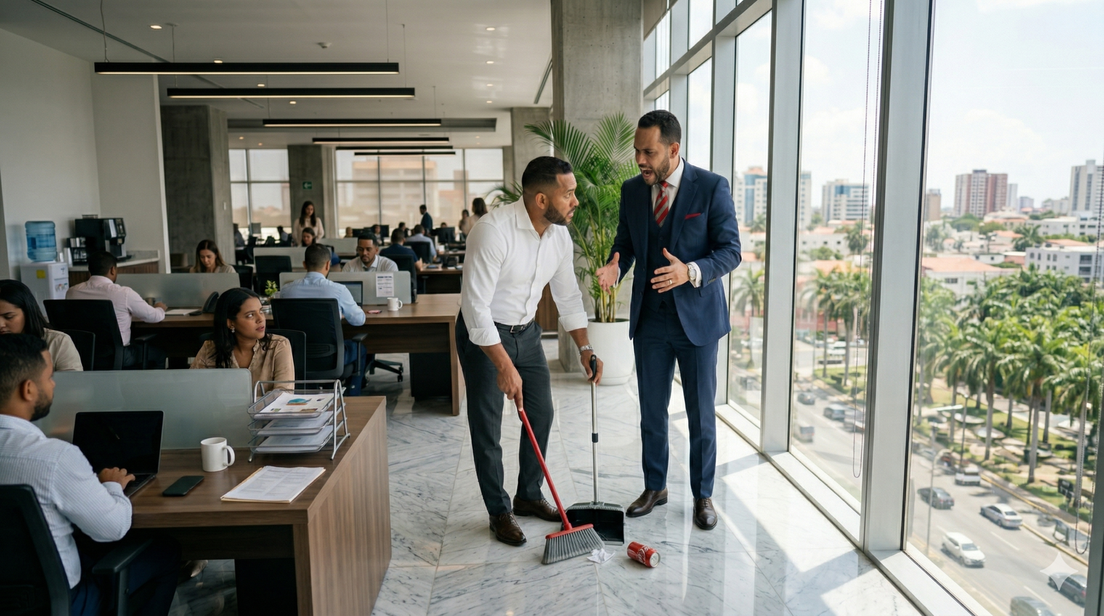 Se levantó torpemente, agarró su carpeta con las manos sudorosas y caminó hacia la puerta con la cabeza gacha, arrastrando los pies. A través del cristal de la oficina, lo vi recorrer el mismo pasillo por el que había entrado triunfante. Lo vi pasar exactamente por el lugar donde seguía el recogedor en la esquina. Su humillación era total y absoluta.