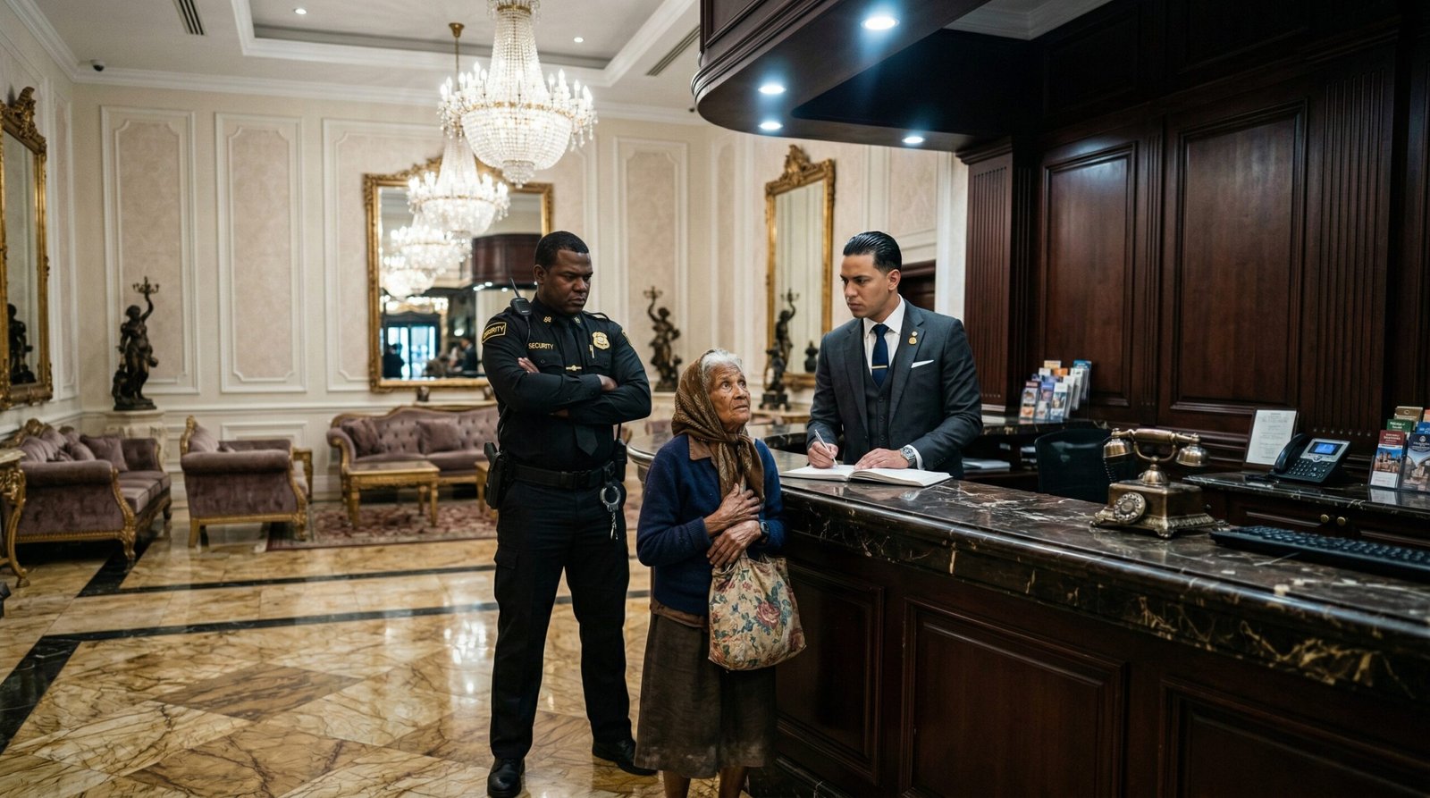 Frente a la mirada atónita de los huéspedes, de los botones y del resto del personal, la despojaron de su elegante saco con el escudo del hotel. La humillación fue total y absoluta. Patricia fue escoltada hacia la puerta de cristal, llorando a gritos, desmaquillada y temblando, siendo echada a la calle exactamente de la misma manera en que ella había intentado echar a la anciana minutos antes.