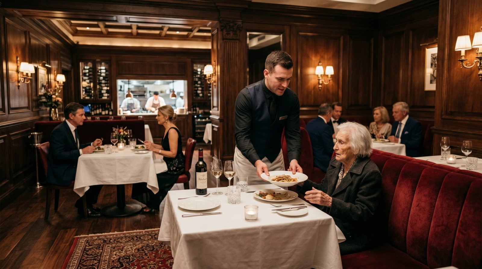 El restaurante de cinco estrellas estaba diseñado para la élite de la ciudad. El ambiente era perfecto, dominado por el olor a cortes de carne premium y el sonido de las copas de cristal. El mesero se movía entre las mesas sintiéndose superior a todos, convencido de que su uniforme le daba poder. Su rostro, completamente limpio y rasurado, no mostraba ni un gramo de empatía por quienes no encajaban en ese mundo superficial. Sus ojos, libres de cualquier tipo de lentes, escanearon a la anciana desde el momento en que se sentó.