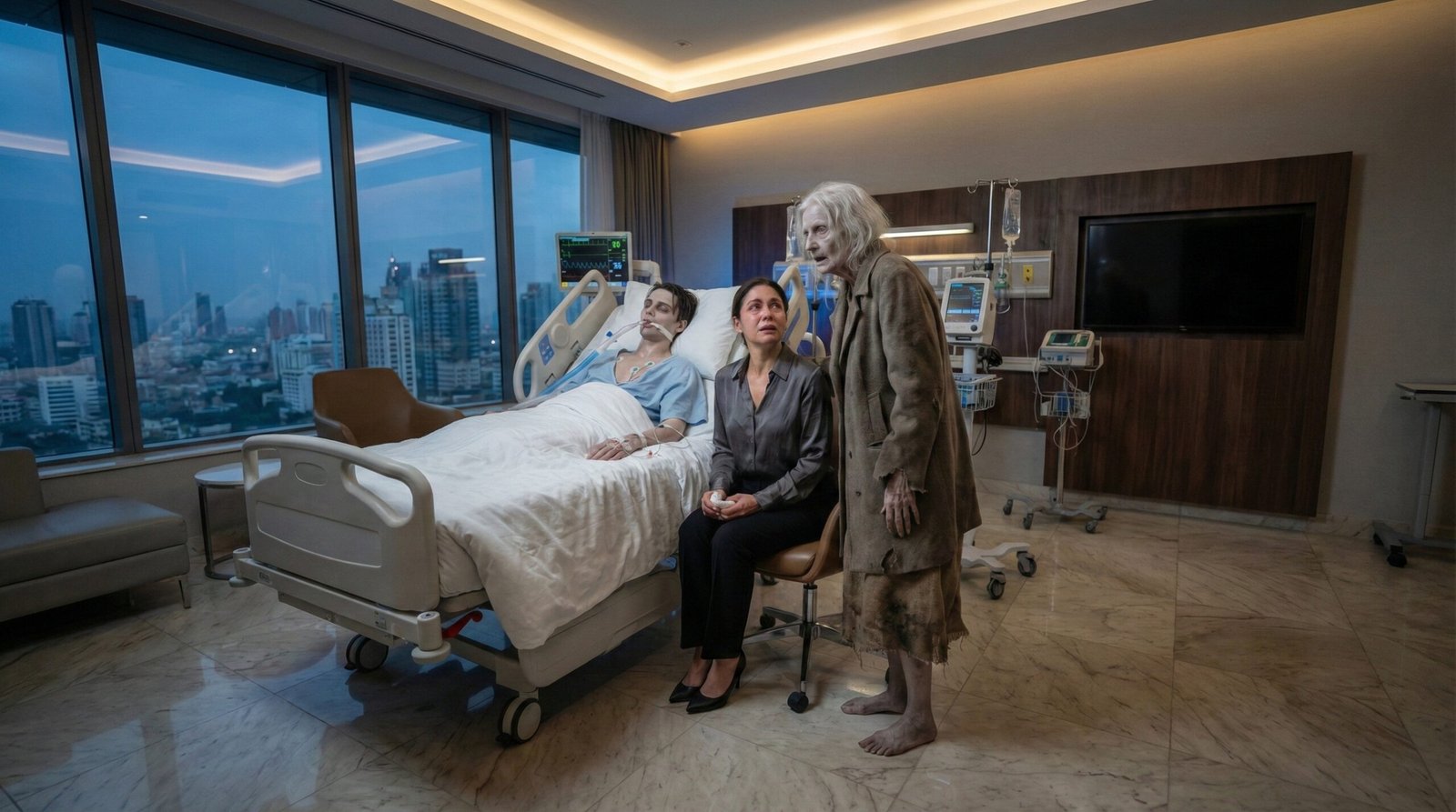 La anciana colocó su mano fría sobre la frente del joven. En ese momento, las luces de la habitación parpadearon. El guardia de seguridad retrocedió, sintiendo una corriente de aire helado que no venía del aire acondicionado. La anciana empezó a susurrar unas palabras en un idioma antiguo, una oración que parecía vibrar en las paredes.