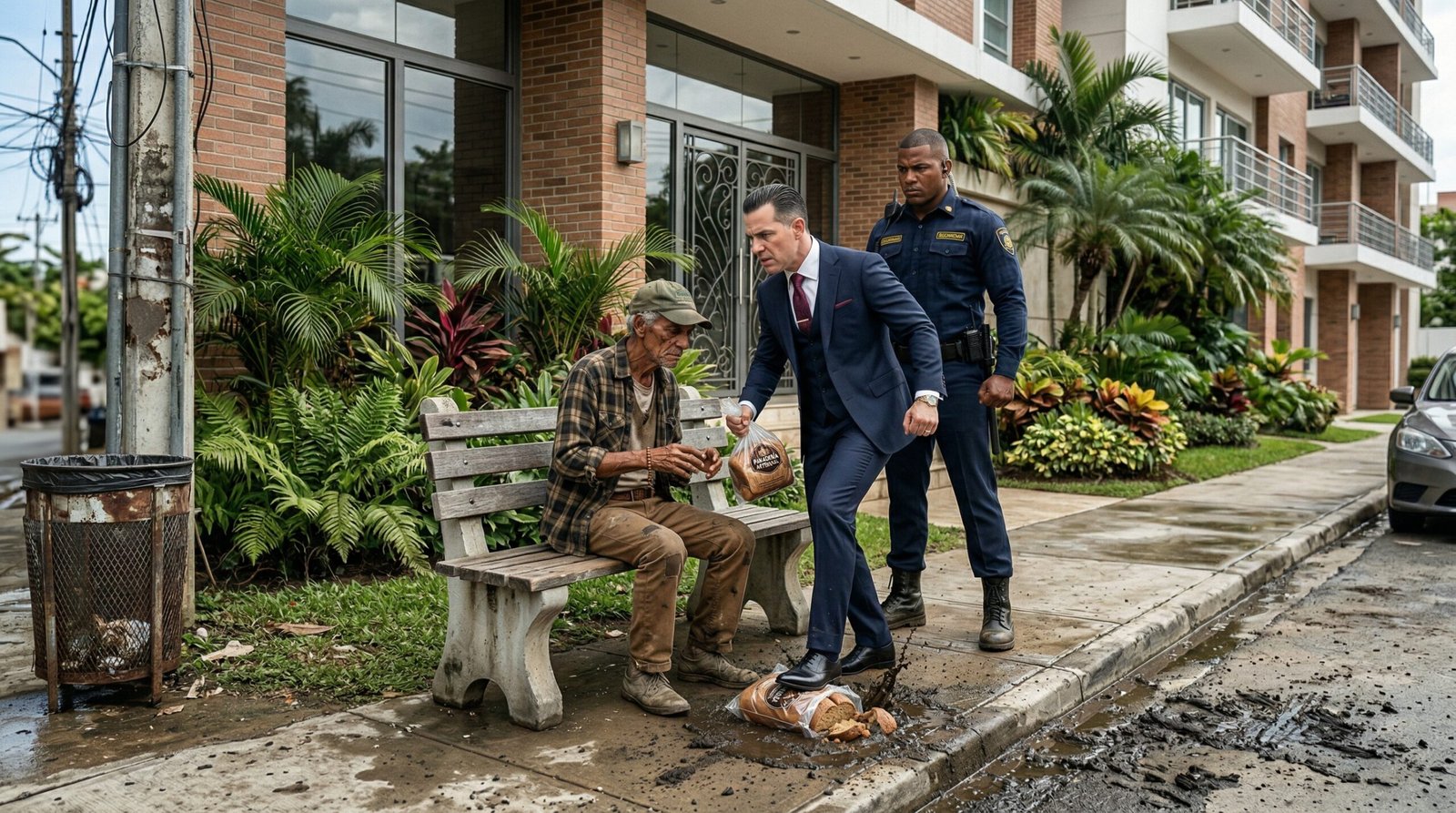 El sol del mediodía caía a plomo sobre el pavimento del exclusivo residencial, creando ondas de calor que distorsionaban el horizonte. El sonido de la corteza dorada y crujiente del pan dulce, siendo aplastada sin piedad por el agudo tacón rojo de diseñador de Valeria, resonó en el silencio de la calle como un cristal rompiéndose.