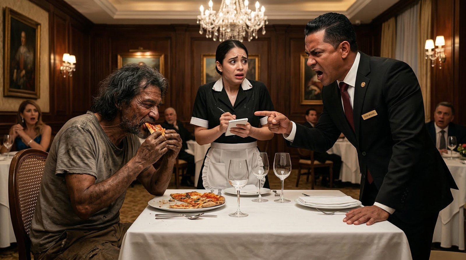 El salón entero soltó un murmullo de asombro. Un político famoso de la mesa contigua desvió la mirada, incómodo. La esposa de un banquero se tapó la boca. Nadie se atrevió a intervenir. Era el rey en su castillo, dictando sentencia sobre un plebeyo alzado.