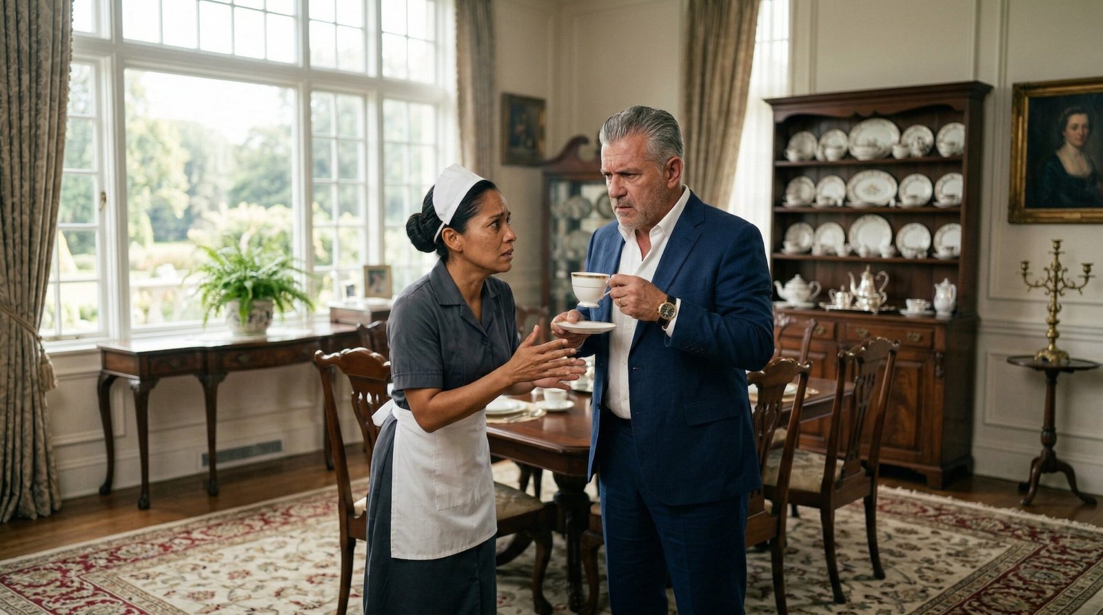 La sonrisa de Elena se congeló instantáneamente. Sus ojos viajaron con pánico desde la taza intacta al rostro imperturbable de su esposo, y luego a la figura de la empleada, que permanecía estoica junto a la pared.