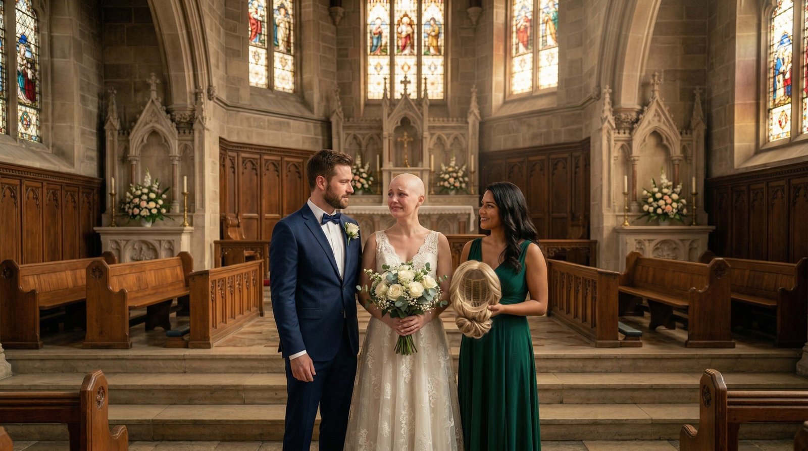 Todo pasó en cámara lenta. Aún puedo recordar el sonido crujiente de las horquillas y los clips arrancándose violentamente de mi cuero cabelludo. Fue un tirón brutal que me hizo echar la cabeza hacia atrás. En una fracción de segundo, el peso reconfortante de mi peluca desapareció, dejando mi cabeza completamente desnuda. El aire frío y acondicionado de la iglesia me golpeó la piel, erizándome hasta el alma.