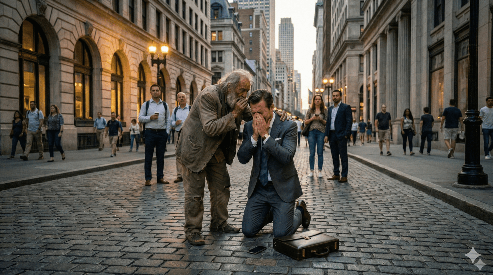 El tráfico de la avenida principal pareció detenerse. Los empleados de la empresa de Don Armando Montalvo, que miraban desde las puertas de cristal giratorias, no podían creer lo que veían. Su jefe, el «Tiburon de las Finanzas», el hombre que no lloró ni cuando murió su propia madre, estaba desmoronado en el suelo, agarrando la tela sucia del pantalón de aquel viejo vagabundo.