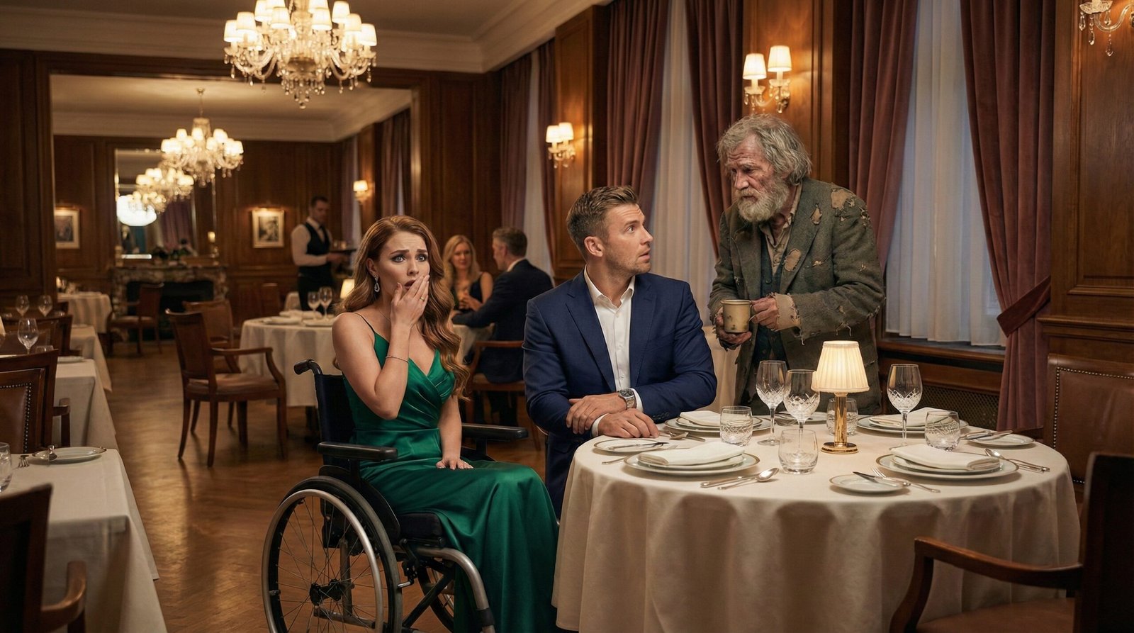 El anciano vagabundo, cuyo abrigo verde oliva desprendía un fuerte olor a asfalto mojado y abandono, no se inmutó ante la presencia del guardia. Sus manos, manchadas de tierra y con las uñas oscurecidas, se estiraron lentamente hacia la inmaculada mesa cubierta por un mantel blanco. Tomó la fina copa de cristal llena de agua helada y bebió un trago largo, pausado, como si tuviera todo el tiempo del mundo.