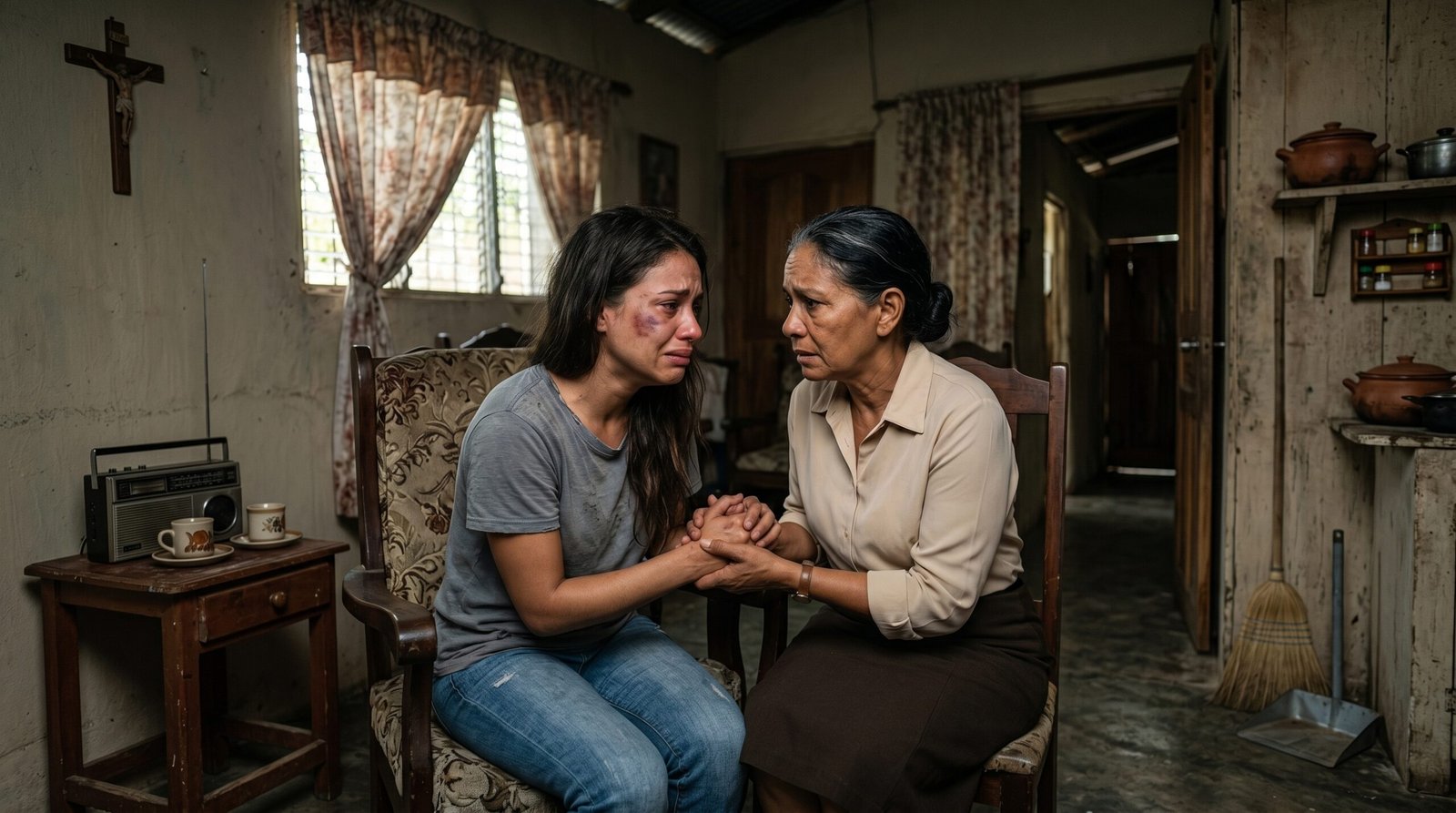 Valeria se dejó caer en el sofá, exhalando un suspiro que parecía contener años de sufrimiento acumulado. Carmen se sentó a su lado y, por primera vez en toda la noche, su postura rígida se suavizó. Tomó la mano de su nuera con ternura.