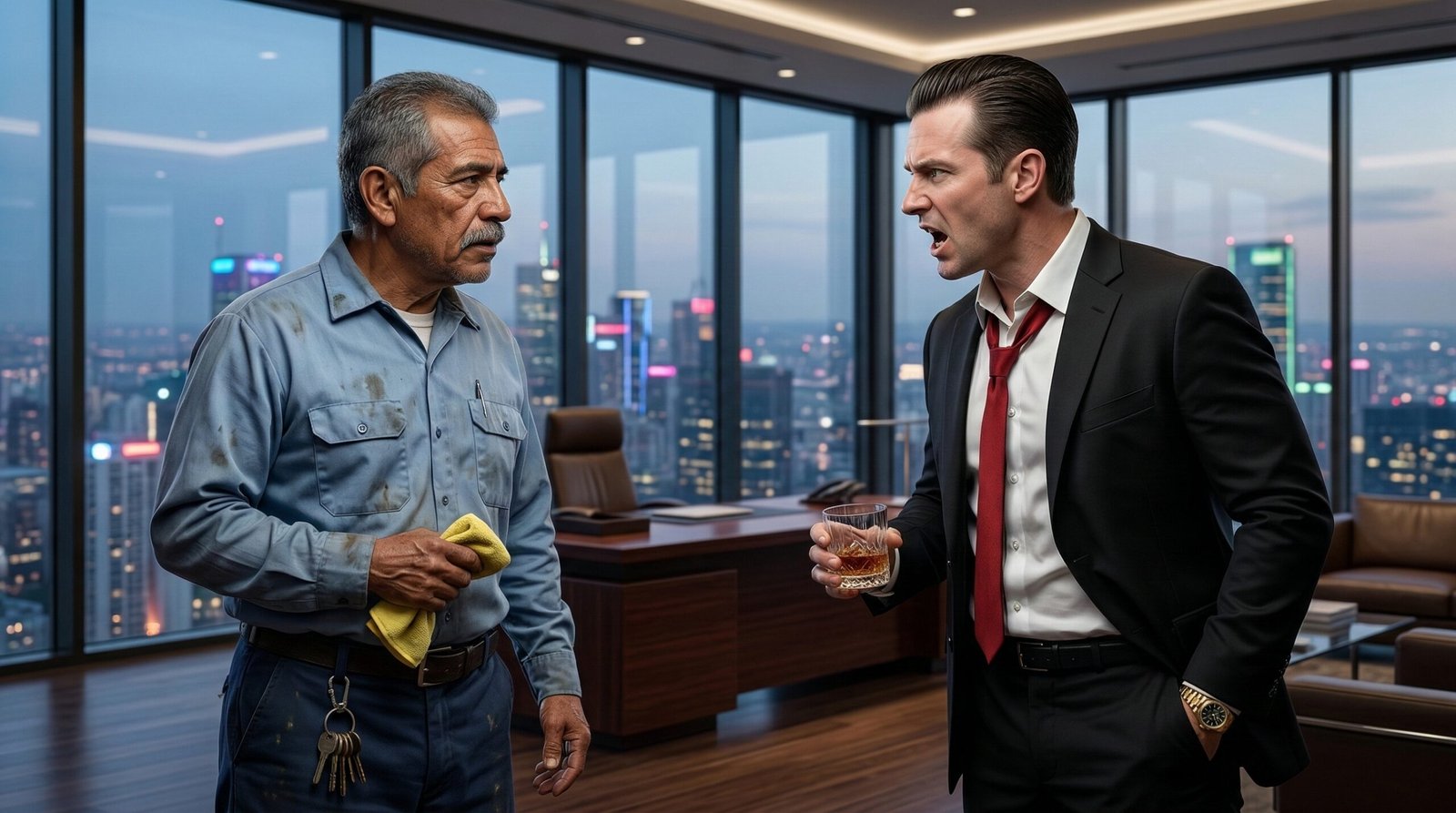 El aire en el lujoso pent-house corporativo se había vuelto pesado, casi asfixiante. A través de los inmensos ventanales de cristal, la ciudad parpadeaba con sus luces de neón, ajena a la tormenta que estaba a punto de desatarse en esa oficina.
