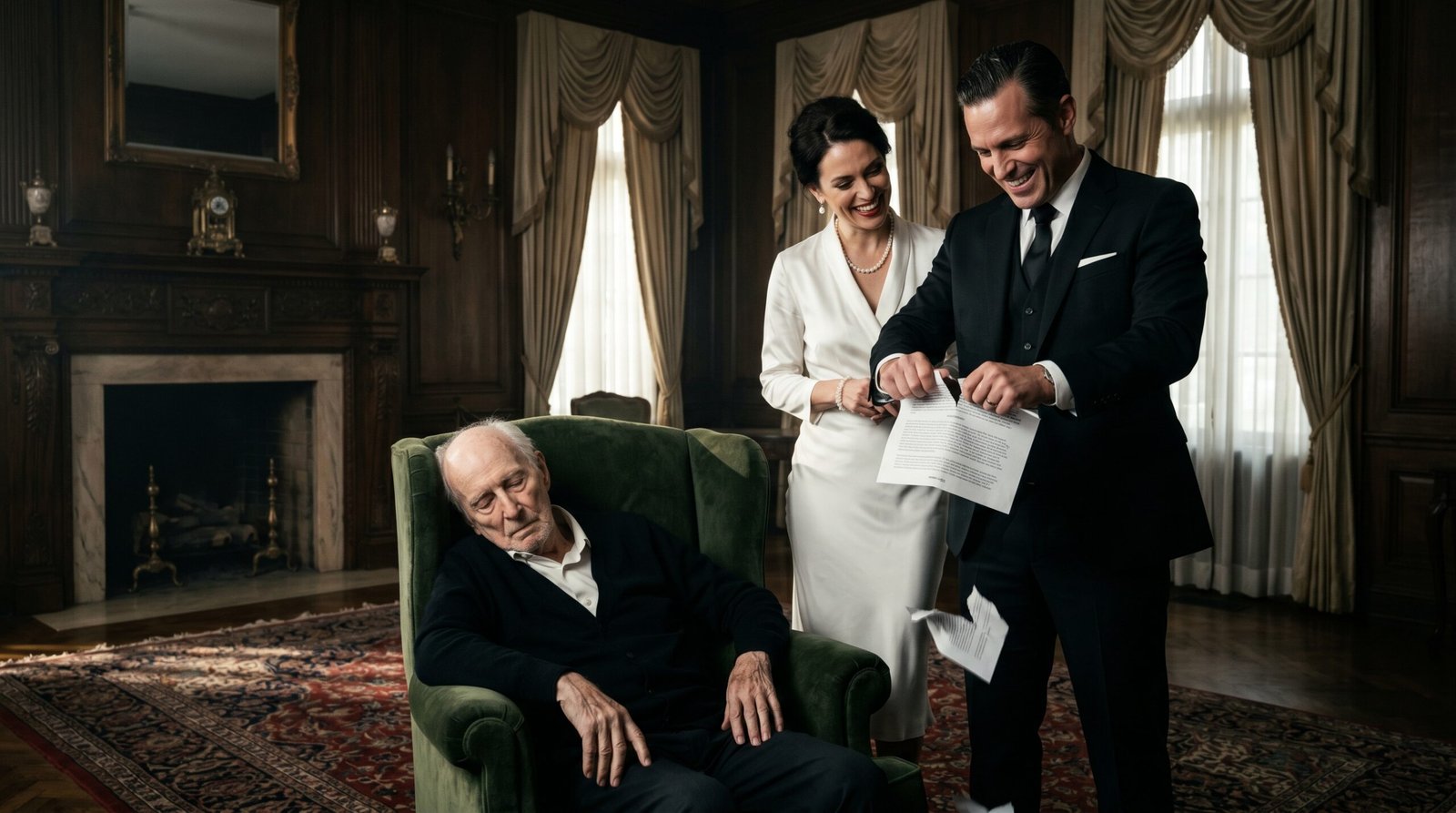 Creyendo que el anciano dormía profundamente bajo los efectos de sus medicinas, el abogado terminó de destrozar el documento legal que protegía el patrimonio de la familia.