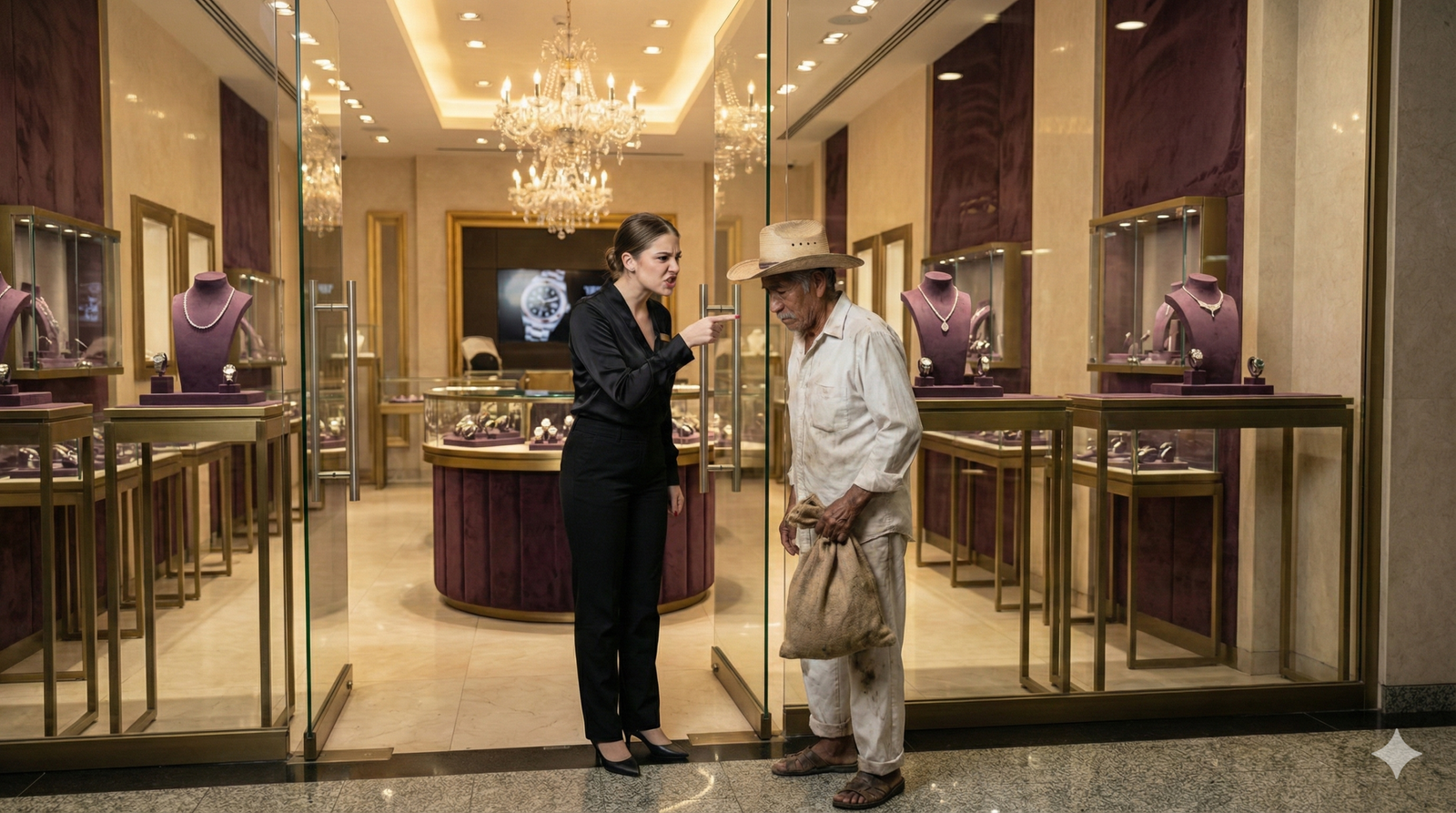 El aire en la joyería se volvió denso, casi irrespirable. La vendedora, aún con el rostro desencajado por la rabia, mantenía el dedo índice apuntando hacia la salida. En su mente, ella era la guardiana de un templo de lujo, y aquel hombre de manos callosas y ropa gastada era una mancha en su perfecto mundo de diamantes y seda.