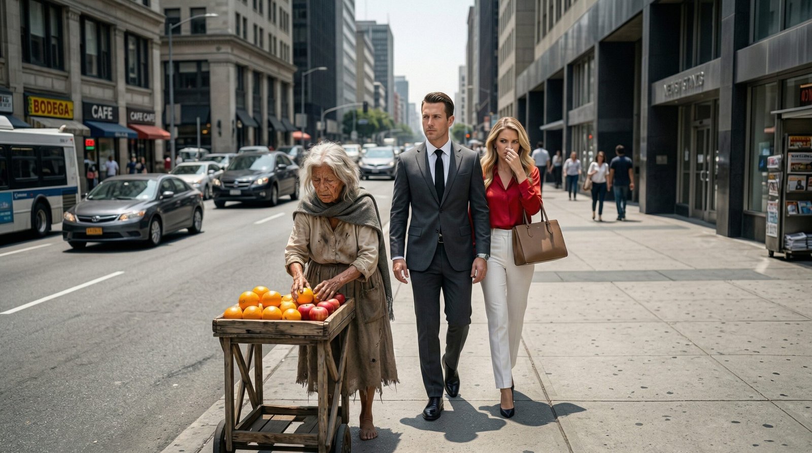 A pocos metros, la pareja seguía riendo. La mujer del vestido caro miraba la escena con repudio. Sus ojos claros estaban bien abiertos, mostrando un desprecio total por la anciana. Se dirigían con calma a su camioneta de lujo, estacionada justo en la esquina de la cuadra.