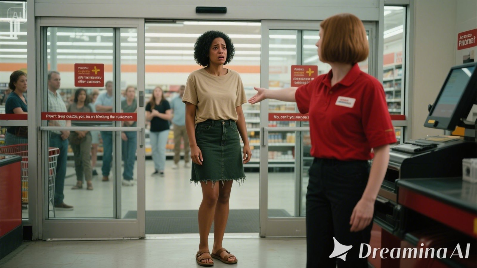 “No, ¿no ves la ropa que tienes? No estás vestida adecuadamente para entrar a este supermercado.”