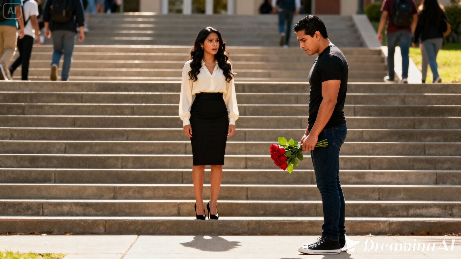En las escaleras de la facultad, a la hora de salida, los estudiantes iban y venían. Risas, mochilas, audífonos, celulares… y en medio de ese ruido, Ángel estaba parado con un ramo de rosas rojas en la mano.