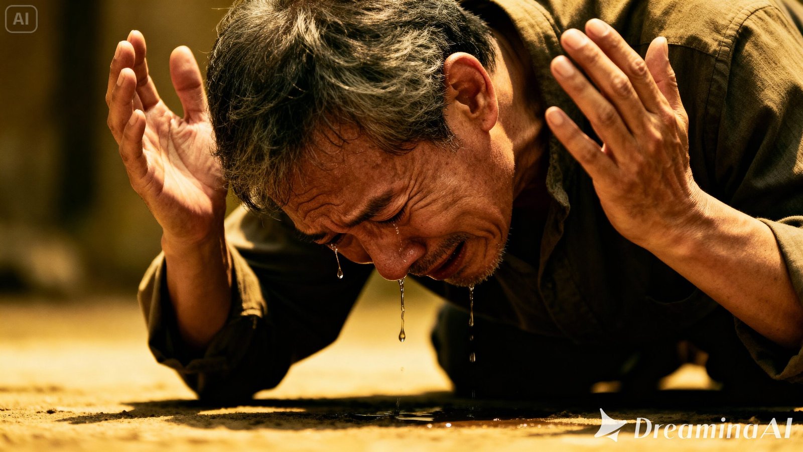 un hombre de rodillas, en el suelo frío, con la ropa gastada, la mano en el rostro y la voz quebrada diciendo: