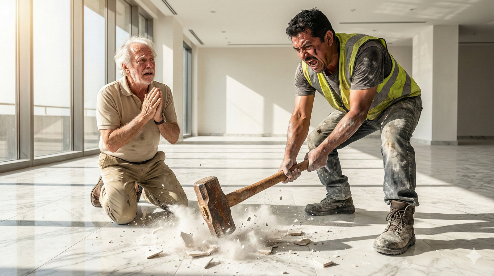 Mientras el eco del primer golpe rebotaba en las paredes, recordé esos tres días de infierno. Había trabajado solo, día y noche, para nivelar ese suelo. Mis rodillas todavía tenían las marcas de estar hincado diez horas diarias esparciendo el pegamento. Mis manos, aunque callosas por años de albañilería, habían sangrado al colocar esas baldosas de porcelanato importado. Lo hice con orgullo, pensando en que ese dinero extra serviría para pagar la colegiatura de mi hija en México. Y ahora, ahí estaba yo, destruyendo mi propia obra maestra, convertido en el villano de la película por culpa de la injusticia.